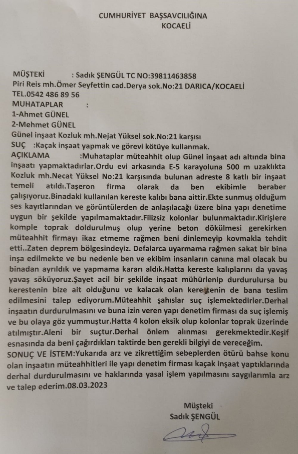 Kocaeli'de bir inşaat firmasının yaptığı binanın depreme dayanıklı olmadığı iddiası üzerine taşeron işçiler şikayette bulundu. 23 daireli 8 katlı yapılması planlanan inşaatta kirişlerinin betonla doldurulması gerekirken toprakla doldurulduğu ve frizlerin kolonlarla bağlantılı olmadığını iddia eden taşeron işçiler şikayette bulundu. Durumu müteahhitlere bildirdiğini ancak geri dönüş alamadığını söyleyen işçiler binanın yapımını bıraktı. Ayrıca işçiler yanlış haritalandırmadan dolayı da binanın birinci katında kolonların kesilerek yerinin değiştirildiğini söyledi. 40 yıldır inşaat işiyle uğraşan ve binanın yapımında da kalfalık yapan Sadık Şengül, yapılan binanın dayanıksız olduğunu, yıkılması için depreme gerek olmadığını söyledi.