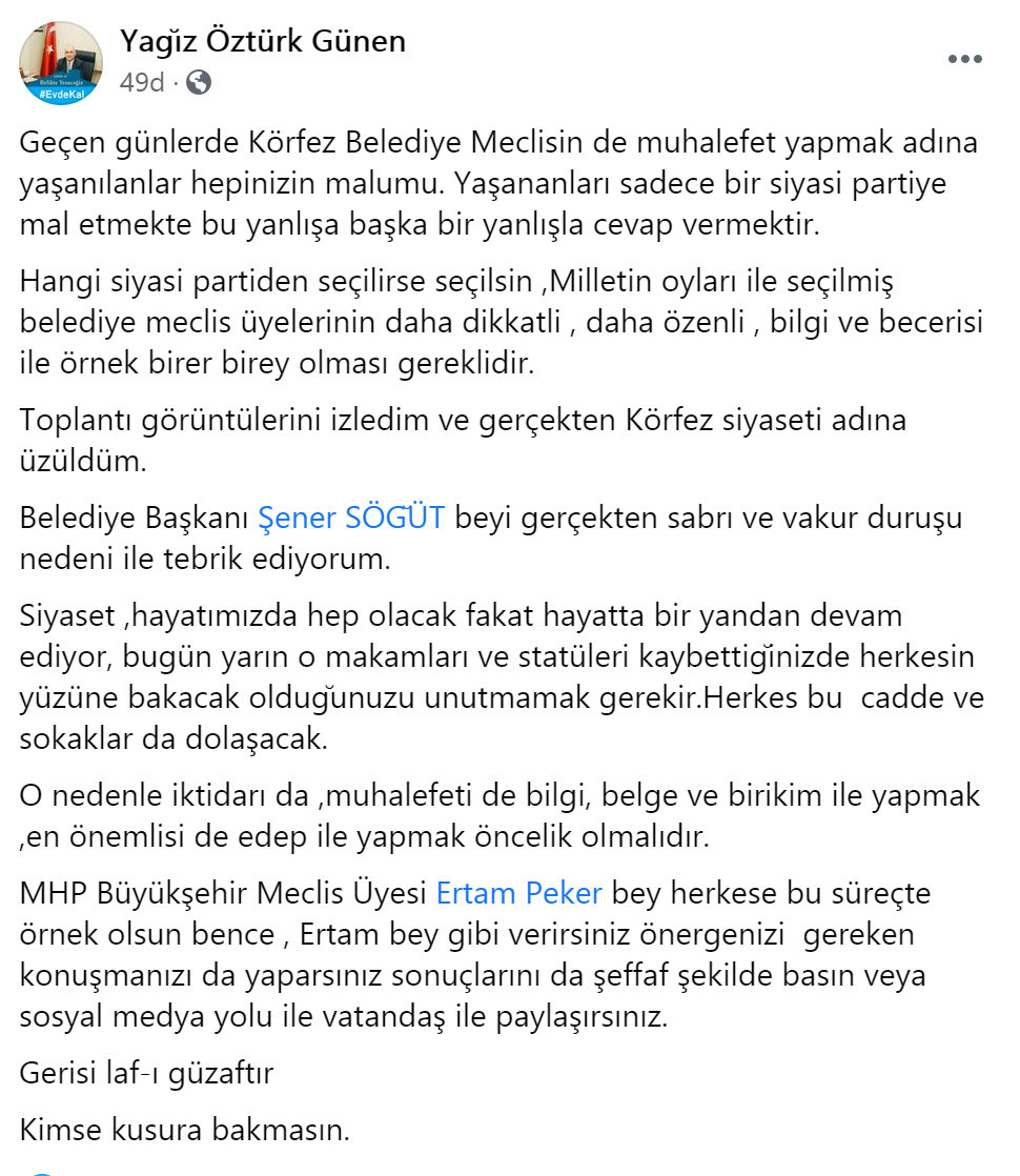 Öztürk,açıklamasında "Geçen günlerde Körfez Belediye Meclisin de muhalefet yapmak adına yaşanılanlar hepinizin malumu. Yaşananları sadece bir siyasi partiye mal etmekte bu yanlışa başka bir yanlışla cevap vermektir.Hangi siyasi partiden seçilirse seçilsin, Milletin oyları ile seçilmiş belediye meclis üyelerinin daha dikkatli, daha özenli, bilgi ve becerisi ile örnek birer birey olması gereklidir. Toplantı görüntülerini izledim ve gerçekten Körfez siyaseti adına üzüldüm.