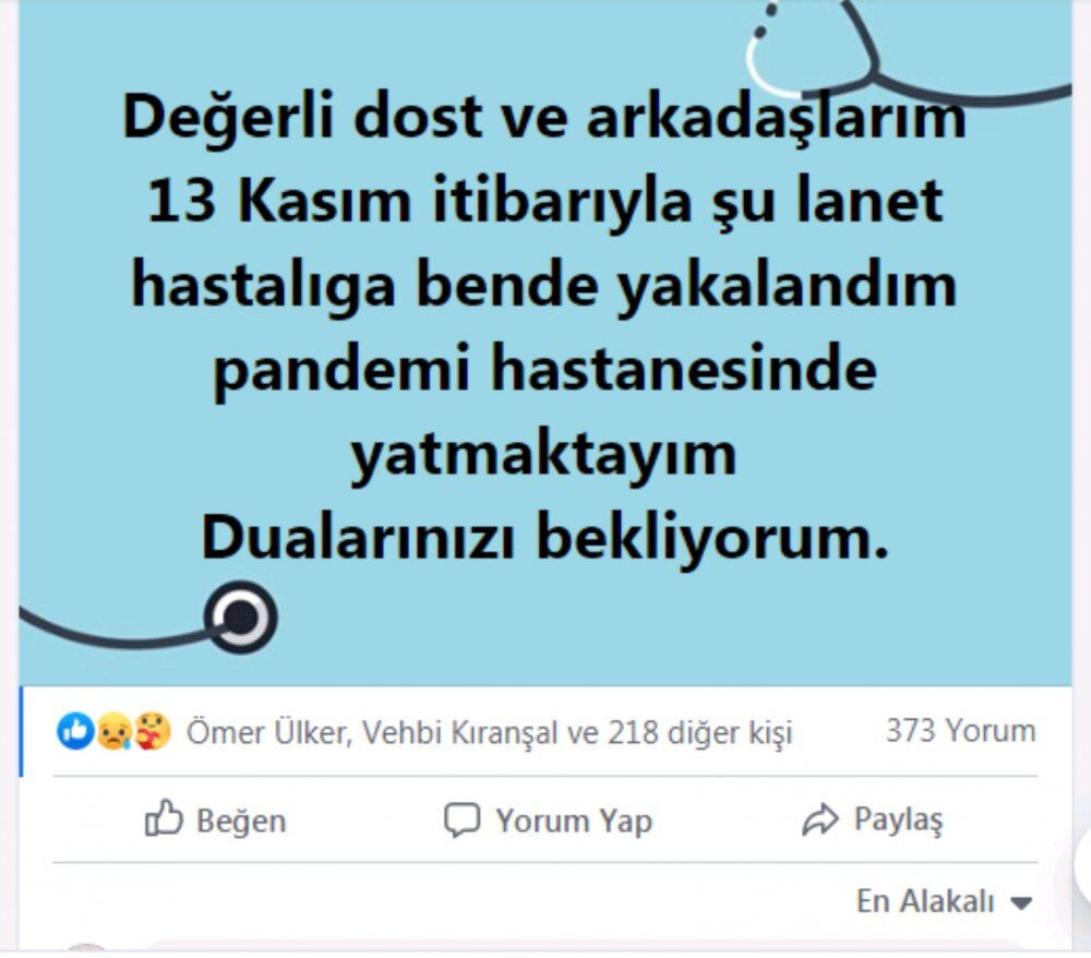 Sosyal medya hesabından konuyla ilgili duyur yapan Ahmet Yücel Şanlı, kendisinin de virüs kaptığını ve hastalığa yakalandığını yazdı. Ahmet Yücel Şanlı, pandemi hastanesinde tedavi ve karantina altına alındığını da duyurdu.