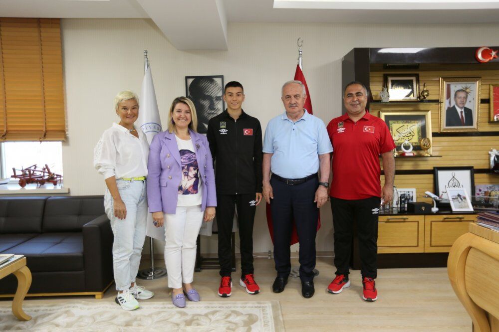 5-15 Temmuz tarihleri arasında Polonya’da düzenlenen Modern Pentatlon U 17 – U 19 Avrupa Şampiyonası’nda mücadele veren Kocaeli Yüzme Kulübü sporcusu A. Ege Önder, partneri Eda Özrodoplu ile birlikte çıktığı mix bayrak yarışında Avrupa üçüncüsü olarak önemli bir başarıya imza attı. Elde ettiği üçüncülükle ülkemize çok önemli bir bronz madalya kazandıran A. Ege Önder, beraberinde annesi Hande Önder, kulüp başkanı Işıl Bozca ve antrenörü Sabri Bozca ile birlikte Derince Belediye Başkanı Zeki Aygün’ü ziyaret etti.