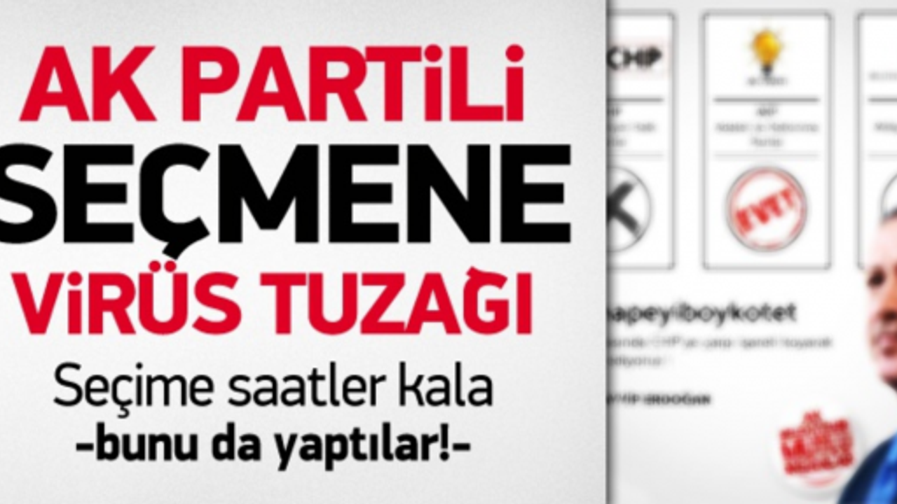 Geçen haftalarda 'Esma tuzağı' ile bir anda sosyal medyada yayılan haber, dakikalar içinde gündeme oturmuştu. Daha sonra bu tuzağı fark eden seçmen yapılan kampanyayı çökertmişti. Daha önce Twitter'dan yapılan çirkin kampanya şimdi de seçime sayılı saatler kala yine sosyal medyada özellikle Facebook'ta virüs ile seçmenin kafası karıştırılmaya çalışışıyor. Facebook'ta ele geçirilen hesaplar ile 'AK Parti'ye evet mührünü bas, CHP'ye kalemle çarpı işareti at' diyerek seçmenin kafasını karıştırarak, oyunun çöpe gitmesi sağlamaya çalışıyorlar. AK Partili seçmenmiş gibi görünen örgütlenmiş grup bu virüsü sayfalarda yayarak seçmeni etkilemeye çalışıyor. Facebook'taki linki sakın tıklamayın çünkü tıkladığınız anda sayfanız ele geçiriliyor ve paylaşımlar yapılıyor.