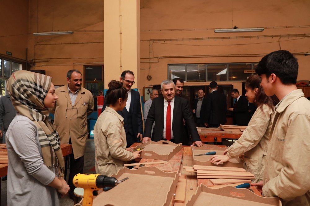 Başkan Baran, daha sonra öğretmenler ile birlikte öğrencilerin eğitim gördüğü ve üretim yaptığı atölyeleri ziyaret etti.1982 yılında mezun olduğu okula her geldiğinde güzel duygular yaşadığını belirten Başkan İsmail Baran, “Meslek liseleri Türkiye’deki üretimi çok daha kaliteli hale getiren ve kalifiye insan kaynağını yetiştiren okullarımızdır. Türkiye’nin üretimde daha ileriye gitmesi için sizlerin en iyi şekilde eğitim alması önemli” dedi.