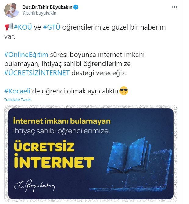 Başkan Büyükakın sosyal medya hesabından, “KOÜ ve GTÜ öğrencilerimize güzel bir haberim var. Online eğitim süresi boyunca internet imkanı bulamayan, ihtiyaç sahibi öğrencilerimize ücretsiz internet desteği vereceğiz. Kocaeli’de öğrenci olmak ayrıcalıktır” diyerek online eğitim süresince internet erişimi sağlanacağı müjdesini verdi.