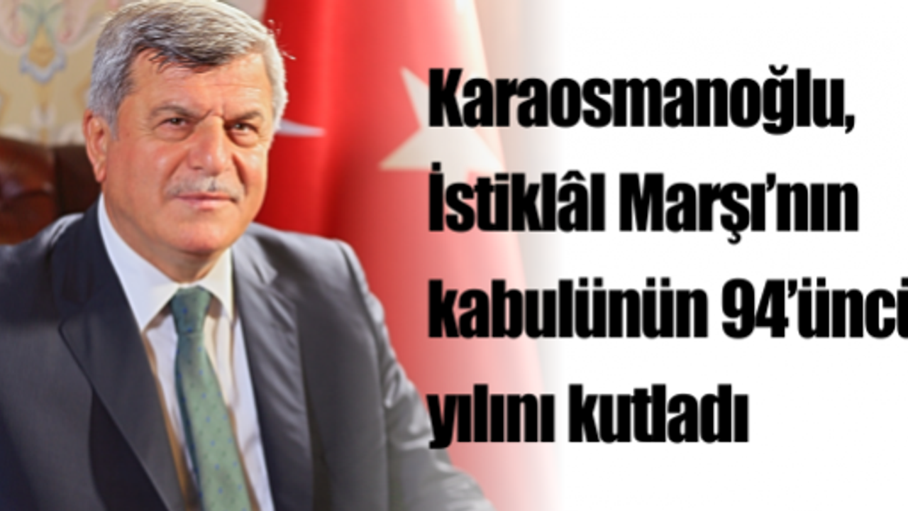 Başkan Karaosmanoğlu mesajında şunları ifade etti: Bundan tam 94 yıl önce Türkiye Büyük Millet Meclisi tarafından açılmış bulunan yarışmada birinci olarak seçilen ve milletvekilleri tarafından ayakta alkışlanarak kabul edilen İstiklâl Marşı, aynı zamanda büyük Şair Mehmet Akif Ersoy’un da Türk Milleti’ne hediyesidir. “İstiklâl Marşı, aziz milletimize ezelden beri hür yaşadığını ve ebediyete kadar hür yaşayacağını, en karanlık günlerinde bile, Hakk’ın vaat ettiği günlerin pek yakında doğacağını müjdelemiştir. Çünkü İstiklal Marşı, bir milletin yeniden dirilişinin sembolüdür.