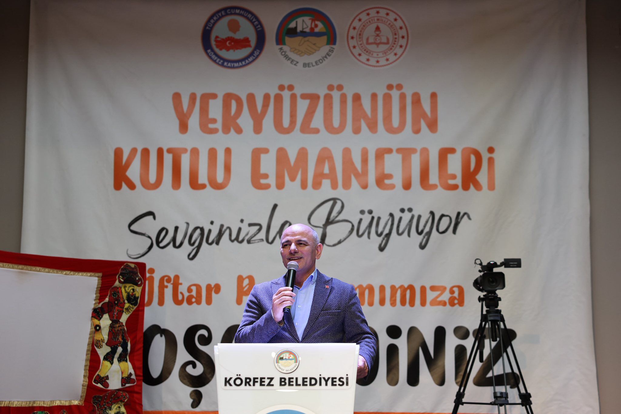Siz kutlu emanetler ile aynı sofrada bulunmak beraber oruçlarımızı açmak bizim için Ramazan ayının en değerli iftarıdır. Çocuklarımız gözümüzün nurudur. İsteriz ki sevgi ve şefkat görsünler, ilgi ve muhabbetle büyüsünler. Hiçbir şeyden mahrum olmasınlar. Her zaman gülsünler, neşe kaynağı olsunlar” ifadelerini kullandı. Başkan Söğüt’ün ardından Körfez Kaymakamı Uğur Kalkar da bir konuşma gerçekleştirdi.