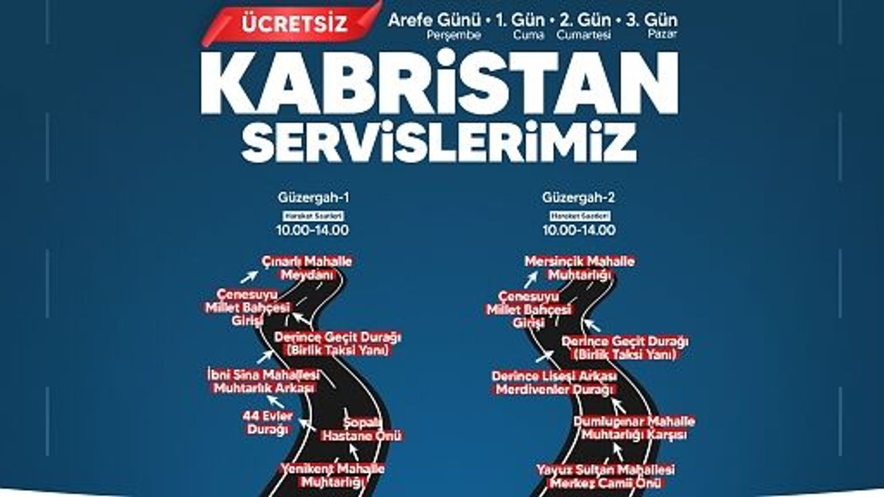 Belirlenen programa göre 10.00 ve 14.00 saatlerinde Yenikent Mahalle Muhtarlığı önünden kalkacak araç, Sopalı Hastane Önü, 44 Evler Durağı, İbni Sina Mahalle Muhtarlığı Arkası, Derince Geçit Durağı (Birlik Taksi Yanı), Çenesuyu Millet Bahçesi Girişi ve Çınarlı Mahalle Meydanı’ndan vatandaşları alarak kabristana götürecek.