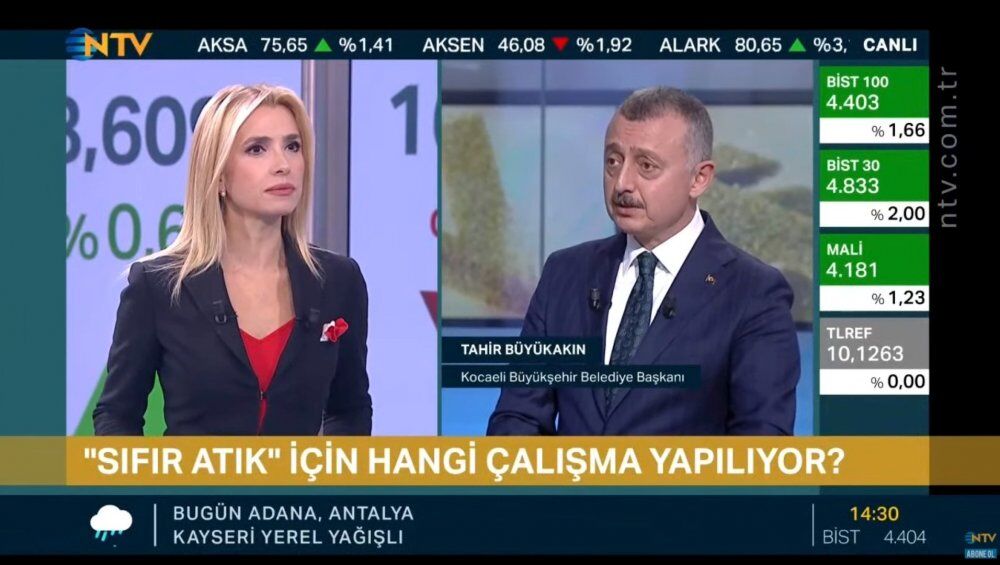 Marmara Belediyeler Birliği ve Kocaeli Büyükşehir Belediye Başkanı Tahir Büyükakın, NTV’de yayınlanan Finans Kafe programına canlı yayın konuğu oldu. Yaklaşık 15 dakika süren programda sunucu Melda Yücel Kocaalp’in sorularını yanıtlayan Başkan Büyükakın, sıfır atıkla önemli bilgiler aktardı. Kocaeli Büyükşehir Belediyesi’nin Sıfır Atık Festivali gibi bir programı başarıyla gerçekleştirdiğine değinen Başkan Büyükakın, gıda güvenliği, iklim değişikliği, yenilenebilir enerji ve sürdürebilir yaşam kaynakları konusunda NTV’nin sorularını yanıtladı. Başkan Büyükakın, Fransa'nın Strazburg kentinde düzenlenen Avrupa Konseyi Yerel Ve Bölgesel Yönetimler Kongresinin 43. Genel Kurulunda Avrupa İklim Konferansı’nın Kocaeli'de yapılması önerisinde bulunduğunu ifade etti.