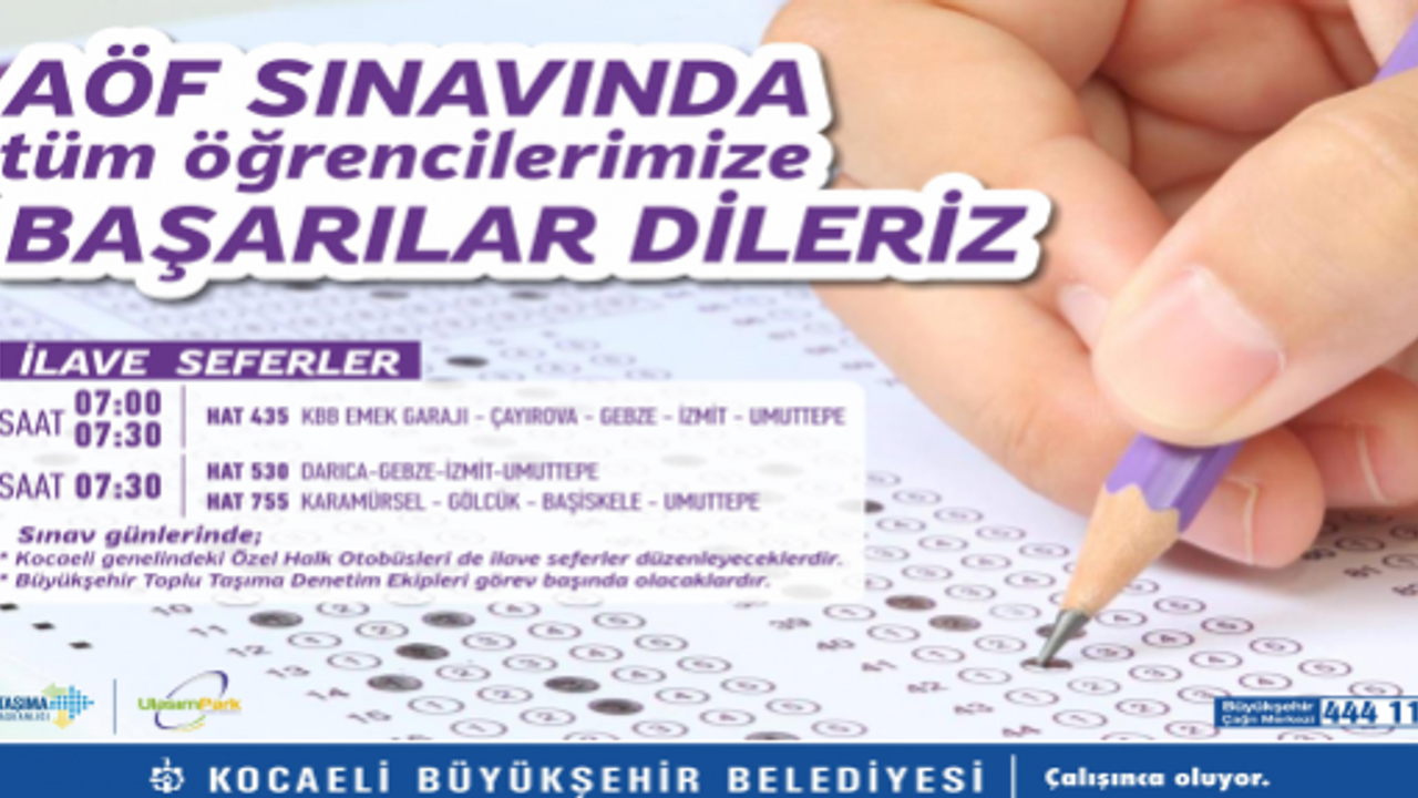 Kocaeli Büyükşehir Belediyesi, 3-4 Haziran Cumartesi-Pazar günlerinde yapılacak olan Açık Öğretim Fakültesi Sınavı'na girecek öğrencilerin ulaşımında sorun yaşamaması için aynı günlerde ek seferler düzenleyecek.