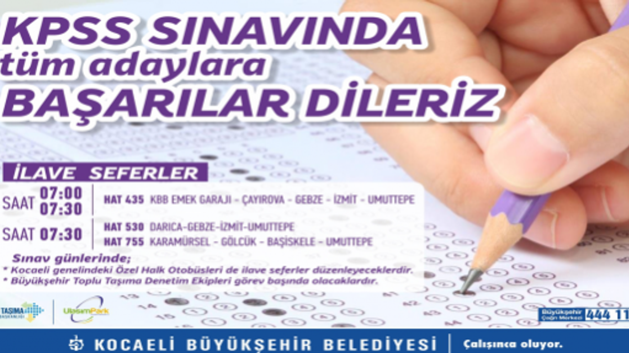 Kocaeli Büyükşehir Belediyesi, 21 Mayıs Pazar günü yapılacak Kamu Personeli Seçme Sınavı’na girecek öğrencilerin ulaşımında sorun yaşamaması için aynı gün ek seferler düzenleyecek. Bu kapsamda saat 07.00 ile 07.30 saatlerinde 435 numaralı hat KBB Emek Garajı, Çayırova, Gebze, İzmit, Umuttepe güzergahında hizmet verecek. Öte yandan 530 numaralı hat Darıca, Gebze, İzmit güzergahında, 755 numaralı hat ise Karamürsel, Gölcük, Başiskele, Umuttepe hattında hizmet verecek.