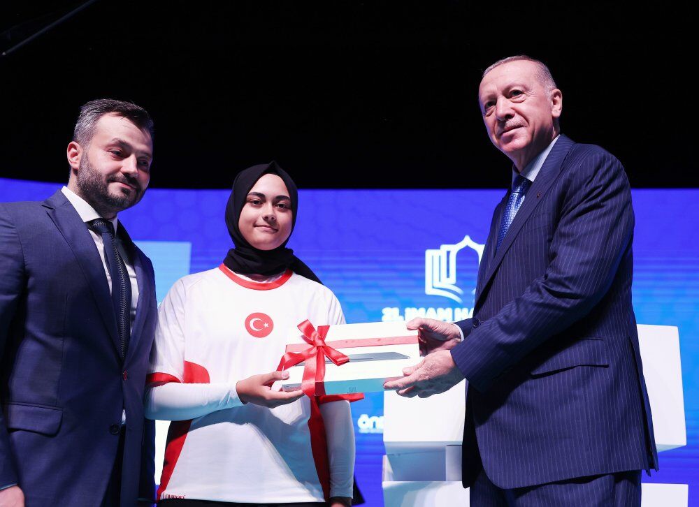 Cumhurbaşkanı Erdoğan konuşmasının öncesinde Paris 2024 Olimpiyat Oyunları'nda ülkemizi başarıyla temsil ederek adını son 8'e yazdıran İstanbul Kız Anadolu İmam Hatip Lisesi 12. sınıf öğrencisi Millî Okçu Elif Berra Gökkır'a hediyesini verdi.