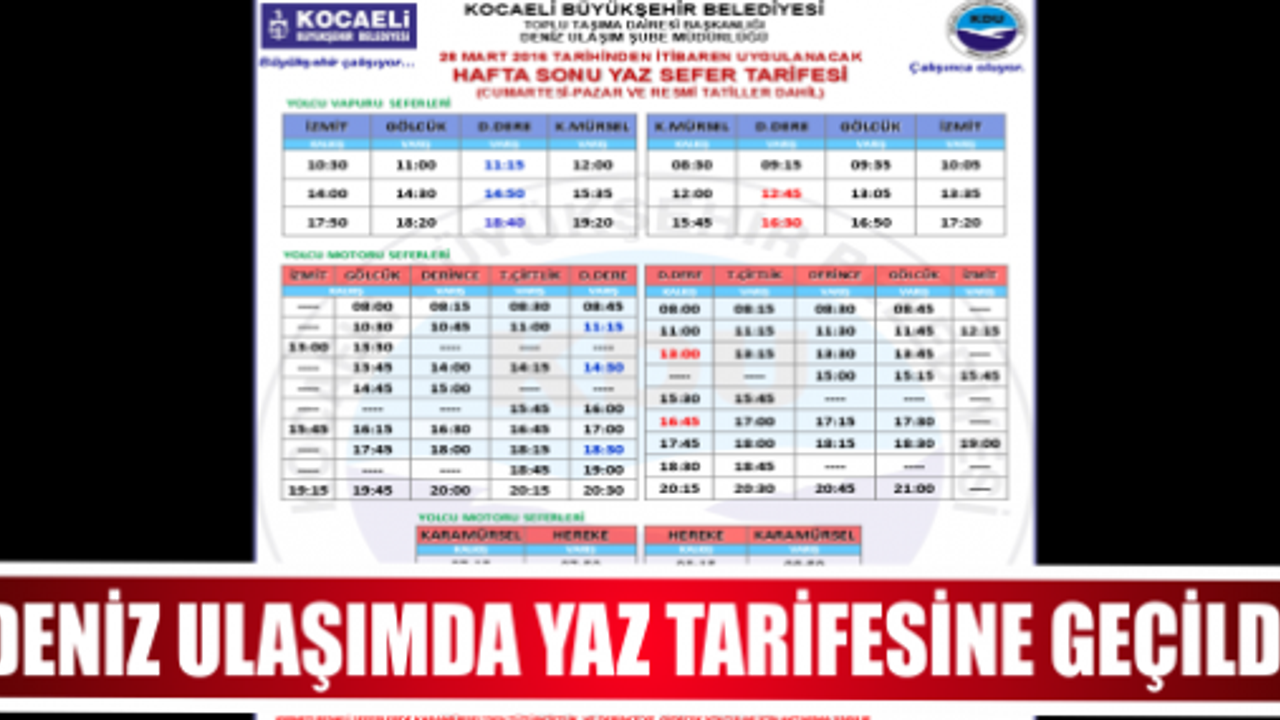 Kocaeli Büyükşehir Belediyesi Toplu Taşıma Dairesi Başkanlığı Deniz Ulaşım Müdürlüğü, 28 Mart Pazartesi günü itibariyle yaz tarifesine geçti. Yaz saati uygulamasına başlanması ile birlikte, çalışma saatlerindeki değişiklikler deniz ulaşım sefer saatleri ile entegre edildi. Deniz ulaşımında uygulanacak olan 2016 yılı yaz tarifesinde hafta içi tüm iskelelerden yerleşim birimlerine sefer yapılacak. Yaz uygulaması tarifesi tüm Büyükşehir Belediyesi Deniz Ulaşım Şube Müdürlüğü iskelelerinden temin edilebilecek.