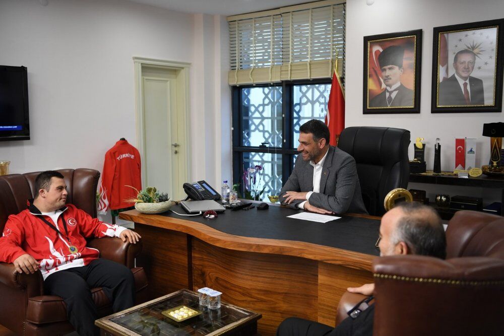 Portekiz'de düzenlenen Down Sendromlular Dünya Judo Şampiyonası'na katılan Türkiye Özel Sporcular Spor Federasyonu sporcuları madalyalarla yurda döndü. T21 kategorisinde altın madalya kazanan Kocaeli Büyükşehir Belediyesi Kağıtspor sporcusu Kartepeli Doğukan Coşar (23) babası Mehmet Coşar ile birlikte Kartepe Belediye Başkanı Av.M.Mustafa Kocaman’ı ziyaret etti. Ziyarette Belediye Başkanı Kocaman “Dünya Judo Şampiyonu Kartepemizin gururu Doğukan Coşar kardeşimi gönülden tebrik ediyor başarılarının devamını diliyorum” dedi.