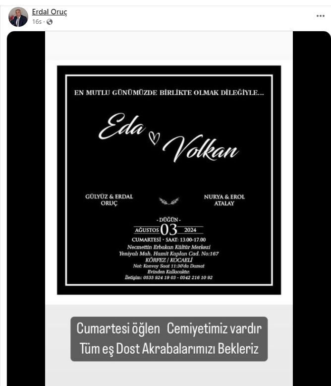 Gülyüz-Erdal oruç çiftinin güzel kızları Eda, düzenlenecek görkemli bir törenle yaşamını Nurya-Erol Atalay çiftinin yakışıklı oğulları Volkan ile birleştiriyor. 3 Ağustos Cumartesi günü 13.00-17.00 saatleri arasında düzenleneceği belirtilen düğün merasimi Körfez Yeniyalı Mahallesi’nde bulunan Necmettin Erbakan Kültür Merkezi’nde gerçekleşecek.