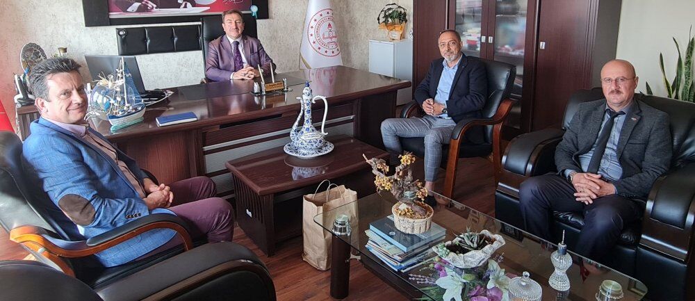 Kurumda görev yapan Evyapport A.Ş. Destek Hizmetleri Müdürü Sedat Topuz ile Kamusal İlişkiler Yöneticisi Yavuz Özcanlı, İlçe Milli Eğitim Müdürü Sergülen Kurt ile makamında bir araya geldi. Özellikle eğitim alanında yaptıkları yatırımlarla isimlerinden söz ettiren Evyapport firmasının yöneticileri Sedat Topuz ile Yavuz Özcanlı, yapılan çalışmalarla ilgili karşılıklı fikir alışverişinde bulundular. Milli Eğitim Müdürü Kurt, konuğu olan ve samimi bir şekilde sohbet ettiği Evyapport idarecilerine ziyaretleri dolayısıyla teşekkür etti.