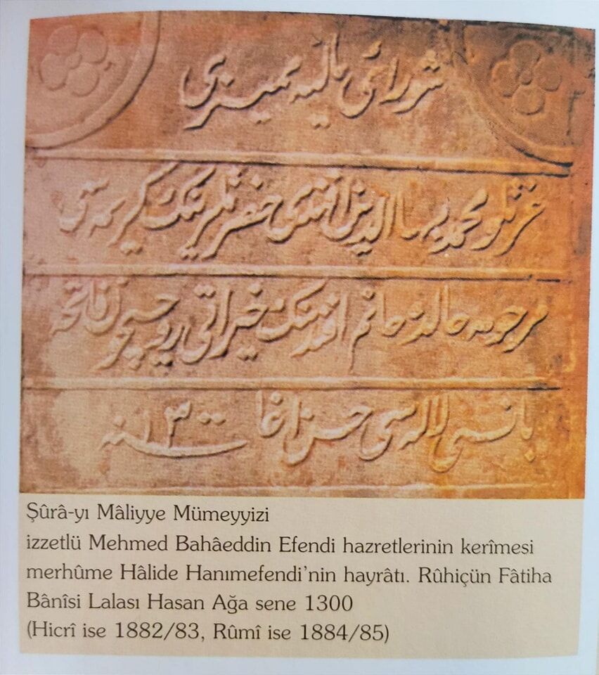 Siretiye’deki tarihi çeşme kitâbesinde, “Şûrâ-i Mâliye Mümeyyizi İzzetli Mehmet Bahâeddin Efendi Hazretleri'nin kerîmesi merhûme Hâlide Hanım Efendi'nin hayrâtı ruhu için fâtiha! Bânisi Lâleşînî Hasan Ağa sene 1300 (1883)” yazıyor.