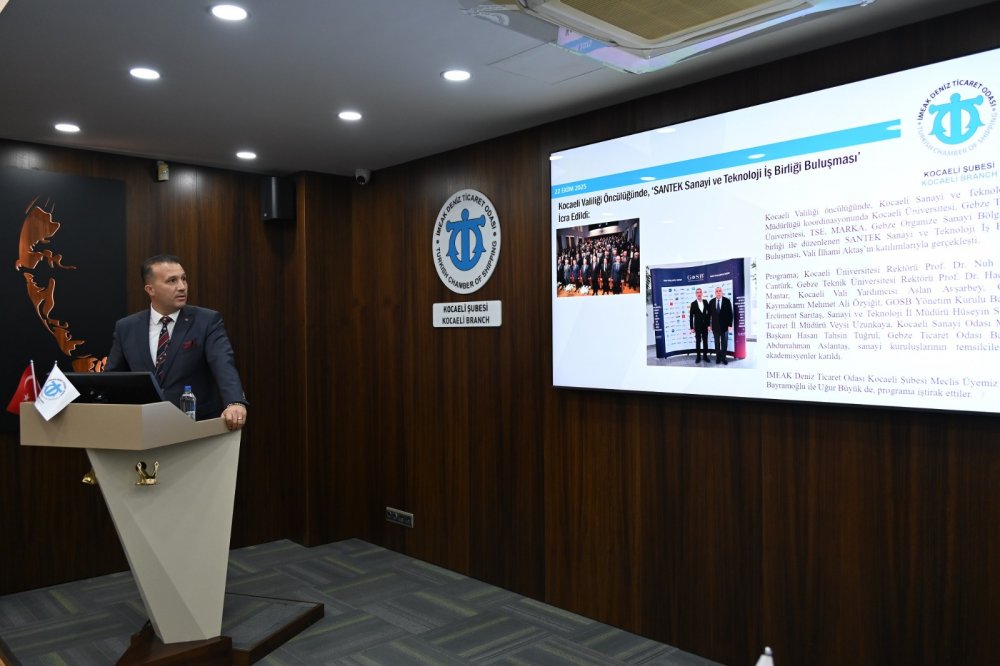 İstanbul ve Marmara, Ege, Akdeniz, Karadeniz Bölgeleri (İMEAK) Deniz Ticaret Odası Kocaeli Şubesi’nin Kasım ayı 38. Olağan Meclis Toplantısı, Meclis Başkan Yardımcısı Yılmaz Sarıaslan’ın yönetiminde şube meclis salonunda gerçekleştirildi. Meclis Başkanı Vefa İbrahim Aracı ise meclise yurt dışından ‘zoom’ aracılığıyla hibrit olarak katıldı. Saygı duruşu İstiklal Marşı’nın ardından toplantının açılış konuşmasını yapan Sarıaslan, hazirunu selamlayıp, meclis gündem ve program akışını sundu.