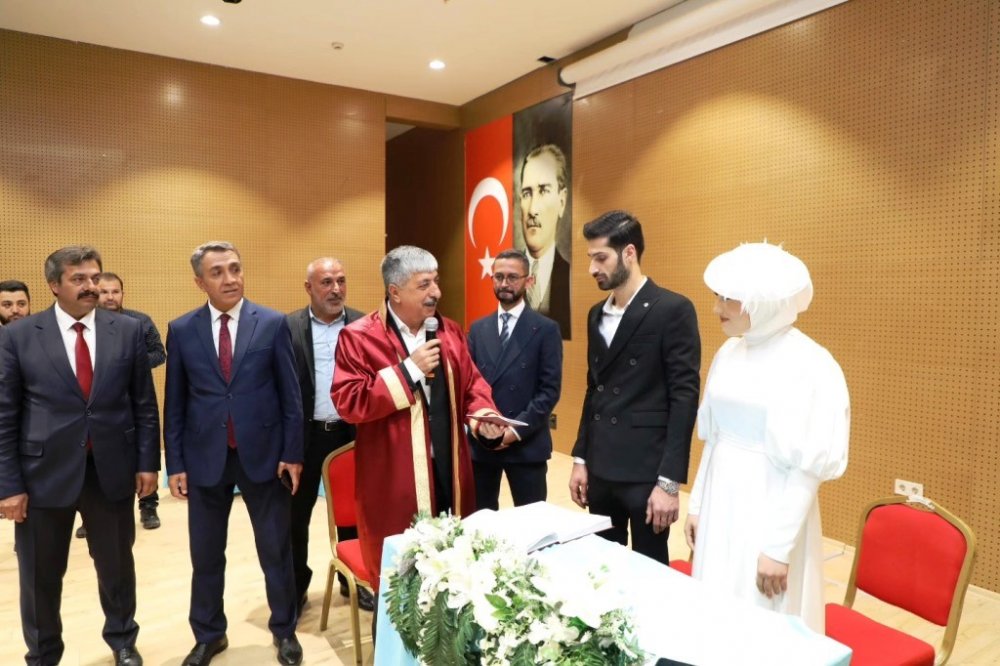 Başkan, evlilik cüzdanını 'Evi dişi kuş yapar' diyerek gelin Betül’e takdim etti.