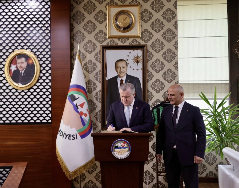Çiçek takdim edilen Bakan Bak, Başkan Şener Söğüt’ün makamına geçerek konuk defterini imzaladı. Sohbet havasında gerçekleştirilen ziyarette Bakan Bak’a Başkan Şener Söğüt tarafından Hereke Halısı hediye edildi. Karşılıklı görüş alışverişinde bulunulan ziyarette Körfez’de ve Kocaeli’nden yapılması planlanan çalışmalarla ilgili olarak istişarelerde bulunuldu.