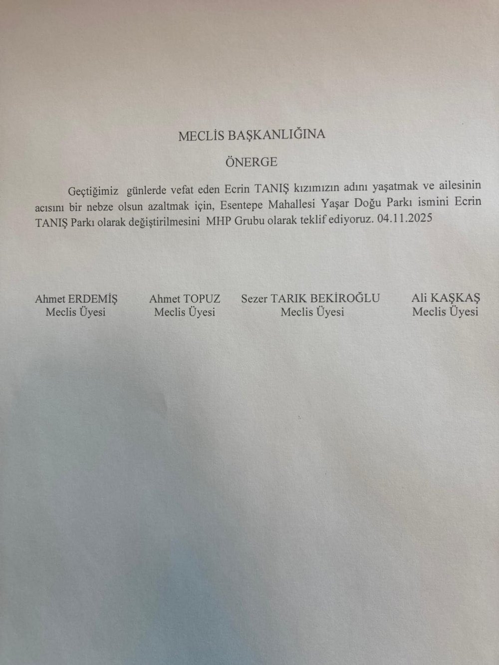Körfez’de geçtiğimiz günlerde hayatını kaybeden Alparslan Tanış’ın evladı Ecrin Tanış’ın adı, Esentepe Mahallesi Yaşar Doğu Caddesi’nde bulunan bir parka verildi. Bu uygulama, bölge halkı tarafından da takdirle karşılandı. MHP Körfez İlçe Teşkilatı’nın önerisiyle gerçekleşen isimlendirme, Belediye Meclisi’nde oy birliği ile kabul edildi. Kararın alınmasında yerel yönetim ve meclis üyelerinin uyumlu çalışması öne çıktı.