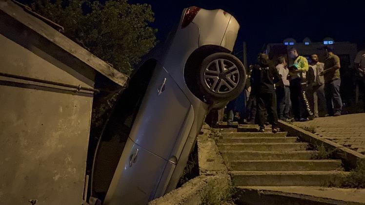 Araç ev ile istinat duvarı arasında sıkıştı.