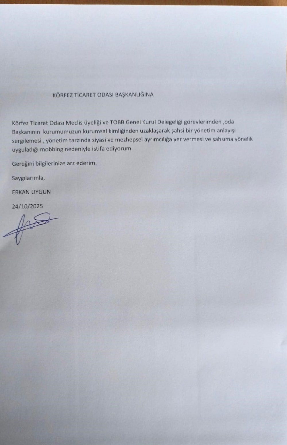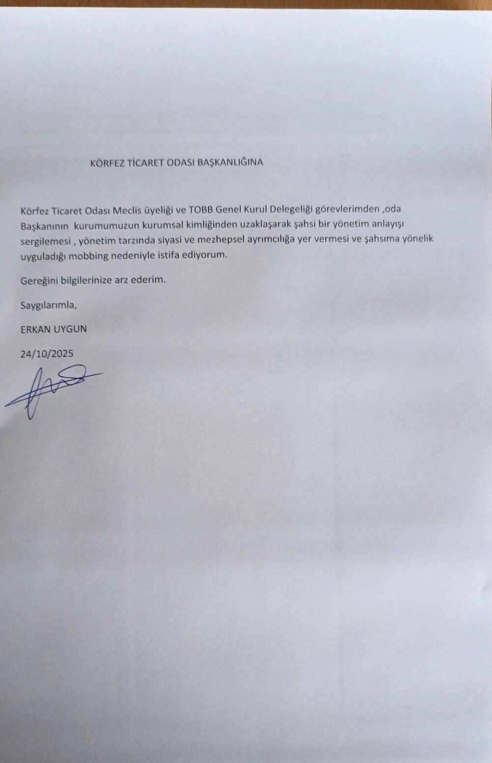 Uygun'un istifa dilekçesinde, "Körfez Ticaret Odası Meclis üyeliği ve TOBB Genel Kurul Delegeliği görevlerimden, oda Başkanının kurumumuzun kurumsal kimliğinden uzaklaşarak şahsi bir yönetim anlayışı sergilemesi, yönetim tarzında siyasi ve mezhepsel ayrımcılığa yer vermesi ve şahsıma yönelik uyguladığı mobbing nedeniyle istifa ediyorum. Gereğini bilgilerinize arz ederim" ifadelerini kullandığı görüldü.