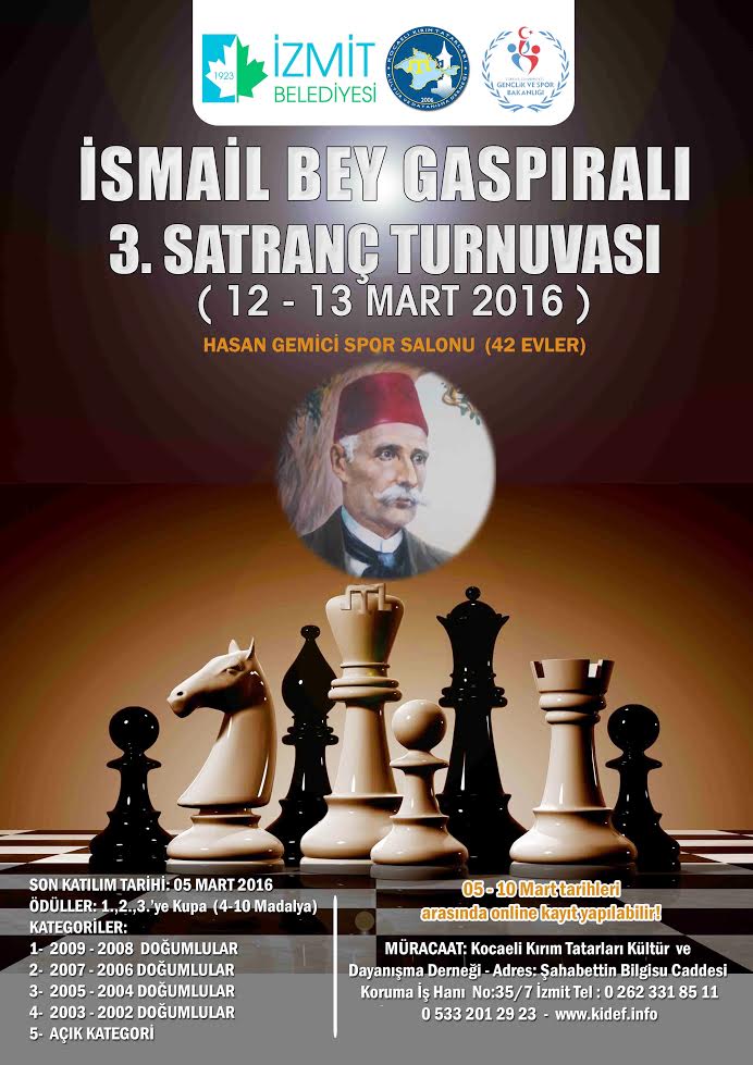 İzmit Belediyesi, İzmit Gençlik Hizmetleri ve Spor İlçe Müdürlüğü ve Kocaeli Kırım Tatarları Kültür ve Dayanışma Derneğinin ortaklığında İsmail Bey Gaspıralı 3.Satranç Turnuvası 12-13 Mart tarihlerinde Hasan Gemici Spor Salonunda yapılacak. Turnuvanın her yıl tekrarlandığını söyleyen yetkililer” 5 kategoride yapılacak turnuvaya katılmak isteyenler 10 Mart tarihine kadar Kocaeli Kırım Tatarları Kültür ve Dayanışma Derneğine kayıt yaptırabilirler. Detaylı bilgi almak isteyenler de derneğin 0262 331 85 11-0533 201 29 23 numaralı telefonlarını arayabilirler” dediler. Turnuvanın büyük ilgi görmesi bekleniyor.