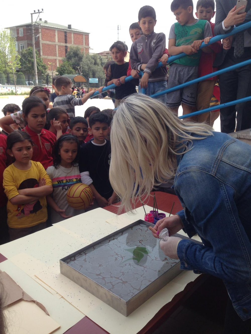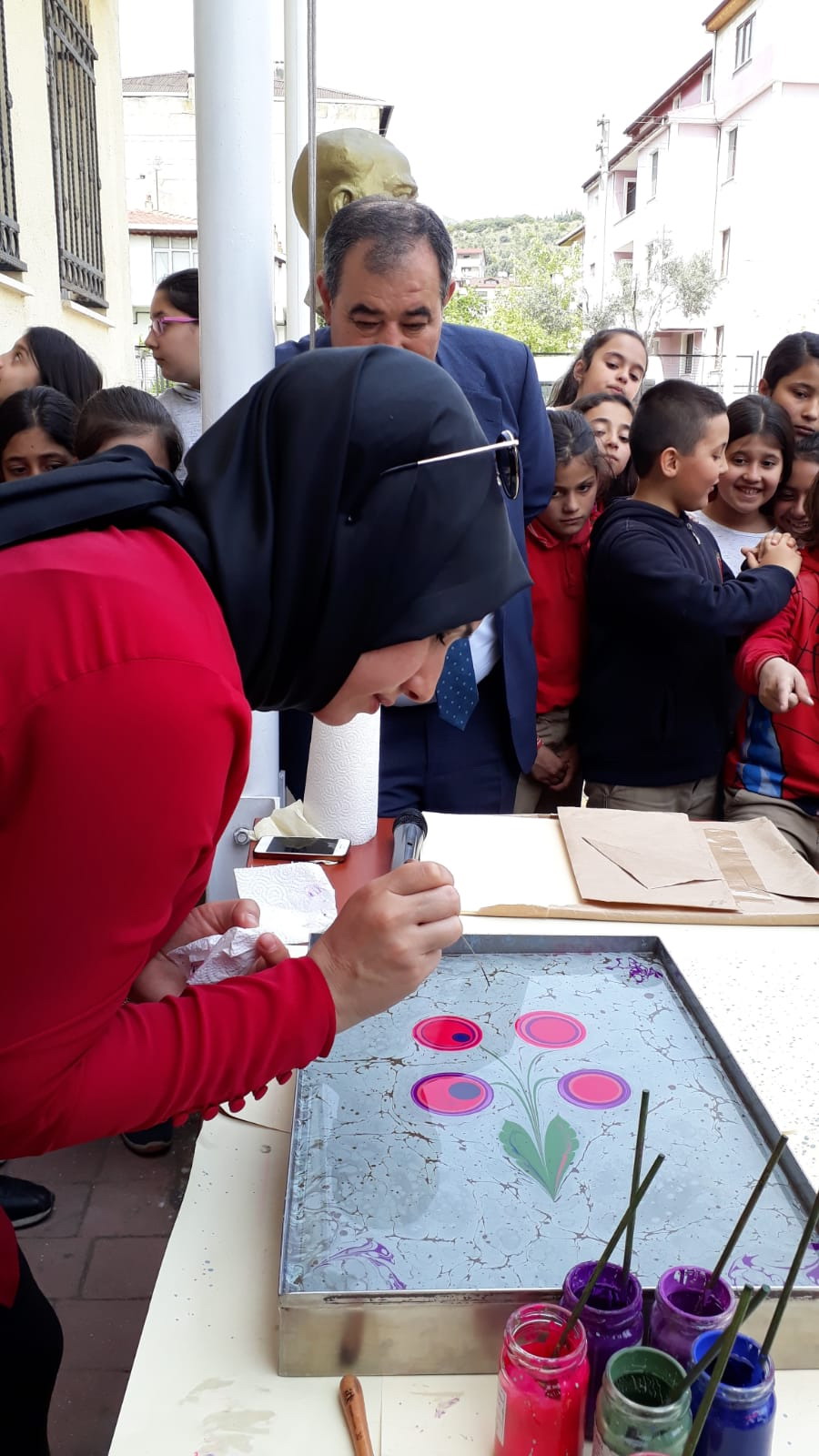 Boyaların suyla buluşmasıyla birlikte şekillerin ortaya çıktığını gören öğrenciler kendilerine söylenen renklerin suyla dansına şahit oldu. Şekillerin ortaya çıkmasının ardından ise yine usta öğretici tarafından kağıt, tekne üzerine bırakılarak görüntünün kağıda çıkması sağlandı. Sudan kağıdın çekilmesini heyecanla bekleyen minik öğrenciler ortaya çıkan eseri alkışlarla karşıladı.