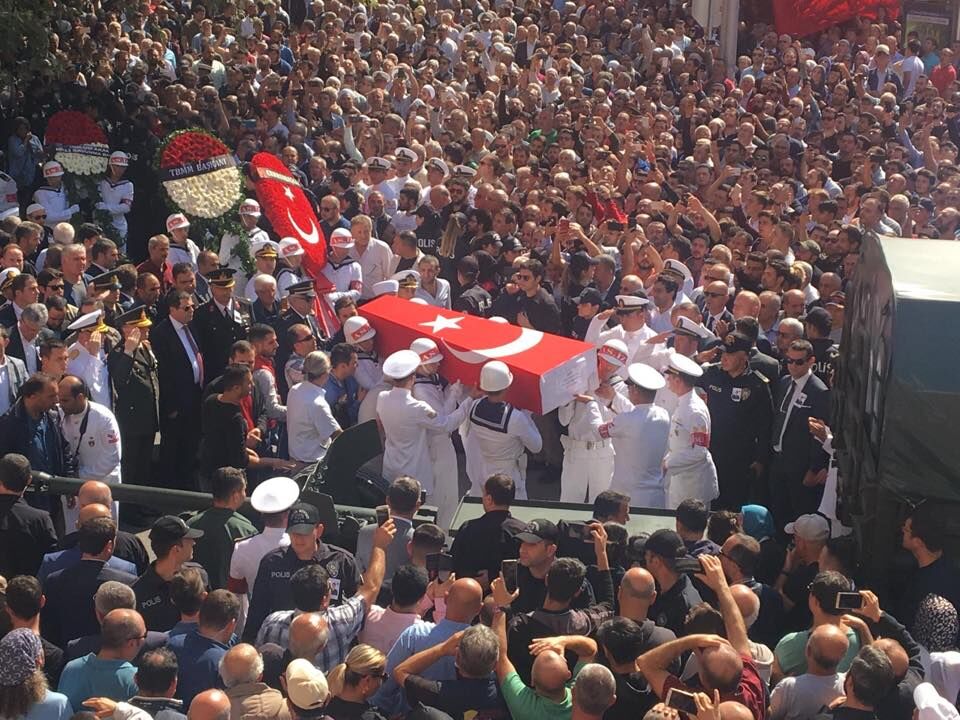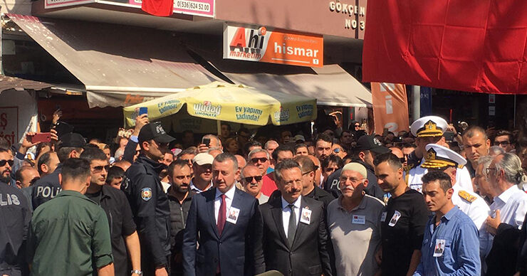 Değirmendere Merkez Camii'nde gerçekleştirilen cenaze törenine Kocaeli Valisi Hüseyin Aksoy, Kocaeli Büyükşehir Belediye Başkanı Tahir Büyükakın, Donanma Komutanı Koramiral Ercüment Tatlıoğlu, Deniz Eğitim, Öğretim ve Garnizon Komutanı Tuğamiral Yalçın Payal, Deniz Hava Üs Komutanı Tuğamiral Alper Yeniel, Gölcük Deniz Ana Üs Komutanı Tuğamiral Refik Levent Tezcan, Kocaeli Jandarma Komutanı Kıdemli Albay Osman Aslan, Gölcük Kaymakamı Cengiz Karabulut, Gölcük Belediye Başkanı Ali Yıldırım Sezer, Körfez Belediye Başkanı Şener Söğüt, Körfez İlçe Başkanı Ramazan Tuna, AK Parti Milletvekili İlyas Şeker, İl Başkanı Mehmet Ellibeş, CHP Milletvekili Haydar Akar, İl Başkanı Cengiz Sarıbay, MHP İl Başkanı Aydın Ünlü, askeri ve mülki erkan ile binlerce vatandaş katıldı.