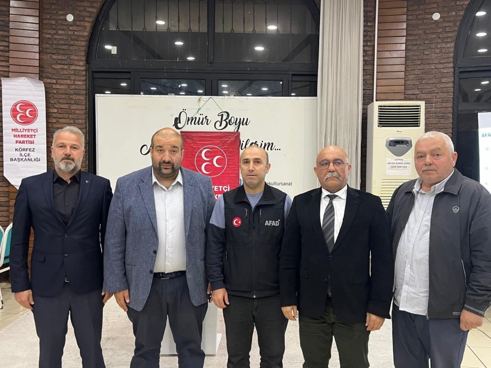 Afet Risklerinin Azaltılması Günü dolayısıyla Milliyetçi Hareket Partisi (MHP) Körfez İlçe Başkanlığı öncülüğünde düzenlenen “Deprem Farkındalık Programı”, belediye yöneticileri, afet uzmanları ve vatandaşların geniş katılımıyla gerçekleşti. Programda afet bilincinin yaygınlaştırılması, olası depremlere karşı alınması gereken önlemler ve kriz yönetimi konuları masaya yatırıldı.