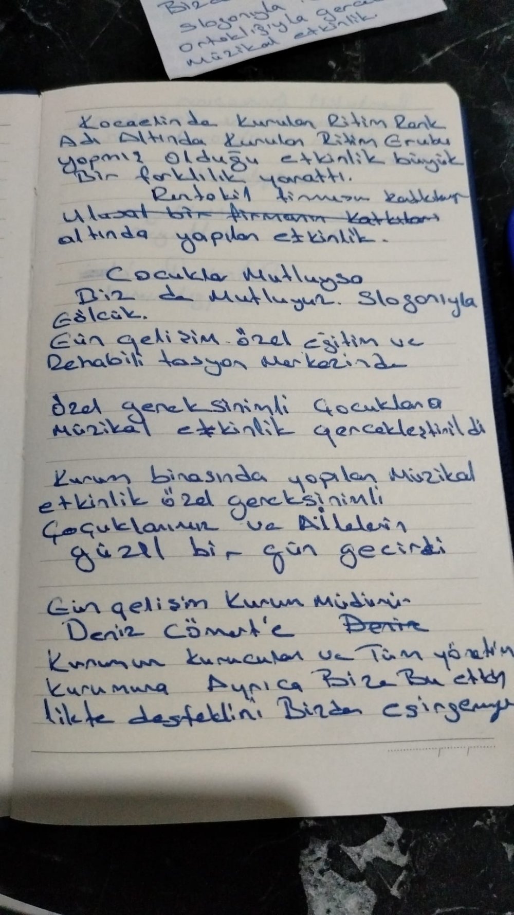“Çocuklar mutluysa biz de mutluyuz” sloganıyla düzenlenen müzikal etkinlik, kurum binasında özel gereksinimli çocuklara ve ailelerine keyifli anlar yaşattı. Etkinlik boyunca çocuklar ritim grubu eşliğinde müzikle buluşurken, aileler de bu özel anlara tanıklık etmenin mutluluğunu yaşadı.
