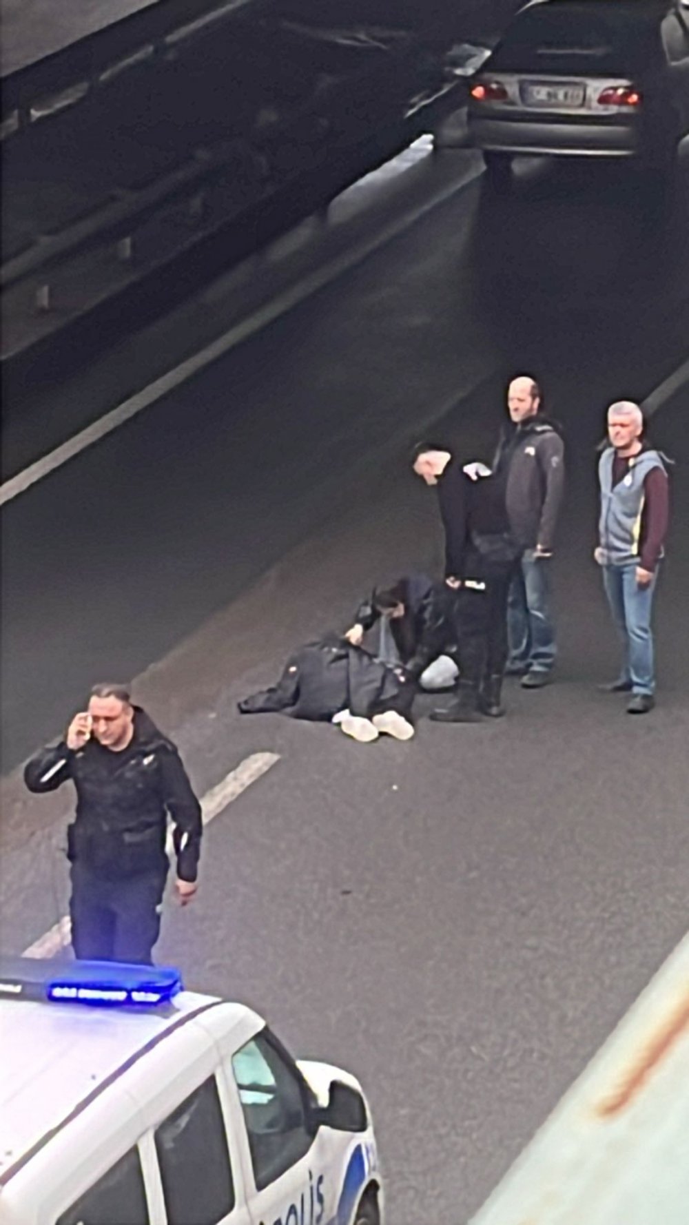 Kocaeli'de 24 yaşındaki genç kız, yanında bulunan kadınla tartıştıktan sonra köprüden atladığı ileri sürüldü. D100 Karayolu’na düşen genç kız ağır yaralanırken, polis ekiplerinden biri, titreyen kızın üzerine montunu örttü.