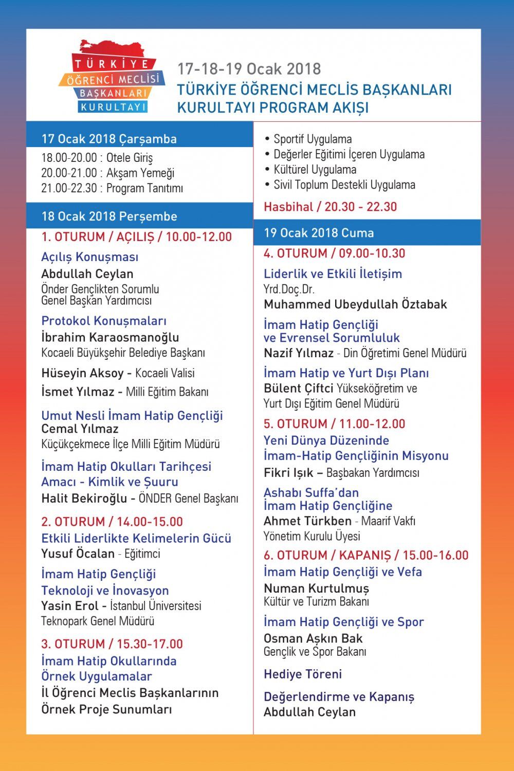Kocaeli Başiskele İlçesi The Ness Otel’de düzenlenecek “Türkiye Öğrenci Meclisi Kurultayı”na Başbakan Yardımcısı Fikri Işık, Milli Eğitim Bakanı İsmet Yılmaz, Kültür ve Turizm Bakanı Numan Kurtulmuş, Gençlik ve Spor Bakanı Osman Aşkın Bak, Kocaeli Valisi Hüseyin Aksoy, Kocaeli Büyükşehir Belediyesi Başkanı ve Türk Dünyası Belediyeler Birliği (TDBB) Başkanı İbrahim Karaosmanoğlu ve Önder Genel Başkanı Halit Bekiroğlu gibi üst düzeyde katılım gerçekleşecek. Ayrıca kurultaya Afyonkarahisar,Ankara, Balıkesir, Bilecik, Bolu, Bursa, Çanakkale, Çankırı, Edirne, Eskişehir, İstanbul, İzmir, Kırklareli, Kırşehir, Kocaeli, Kütahya, Manisa, Sakarya, Tekirdağ, Uşak, Zonguldak, Bartın, Yalova, Karabük ve Düzce illerinden İmam-Hatip Okulu öğrencisi, mezunu, mensubu olan birçok kişi katılım sağlayacak.
