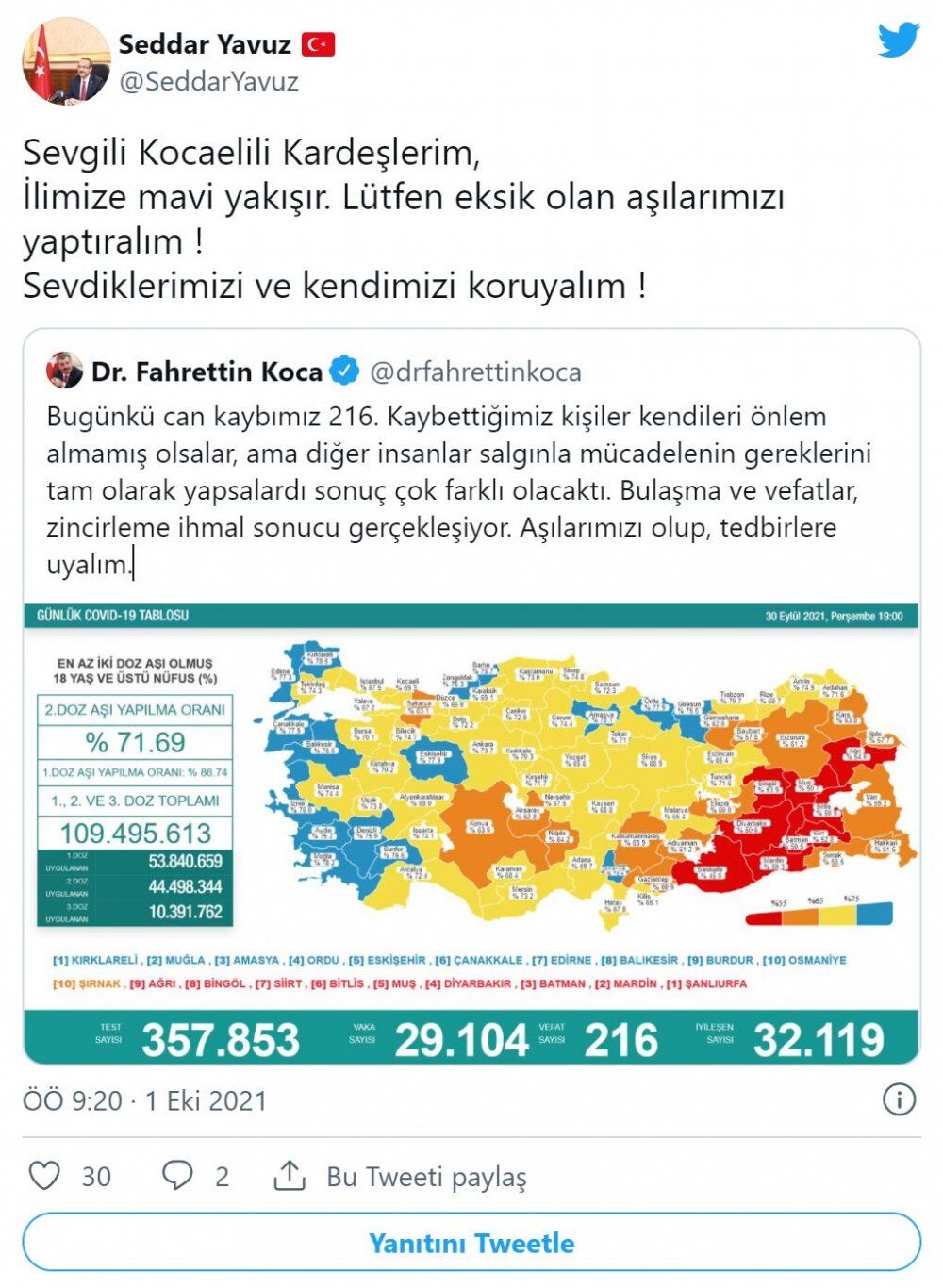 Kocaeli Valisi Seddar Yavuz vatandaşlara aşı uyarısında bulundu. "Kocaeli'ye mavi yakışır" diyen Vali Yavuz "Sevgili Kocaelili kardeşlerim, ilimize mavi yakışır. Lütfen eksik olan aşılarımızı yaptıralım! Sevdiklerimizi ve kendimizi koruyalım" ifadelerini kullandı.