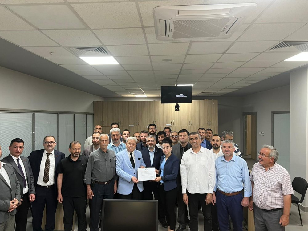 Aras’ a mazbatasını alırken il yönetim kurulu üyeleri eşlik ettiler.