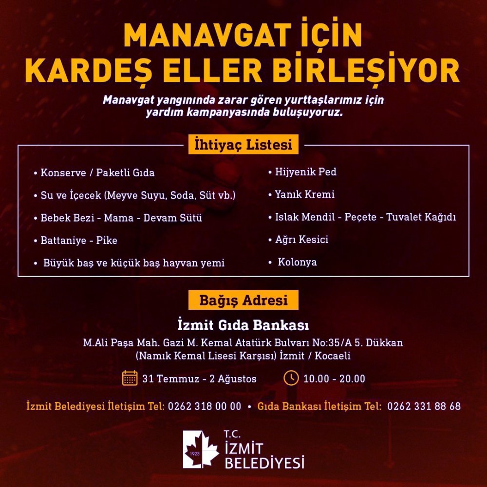 Ülkemizin birçok yerinde devam orman yangınları ile mücadele eden vatandaşlar için yardım kampanyası başlatan İzmit Belediyesi, bugün saat 20.00’ye kadar Gıda Bankası’nda yalnızca ayni yardımları toplamaya devam edecek. İzmit Belediyesi, önceden yaşanan acı olaylara karşı duyarsız kalmayan, kardeşlerini yalnız bırakmayan İzmitlileri destek olmaya davet ediyor.
