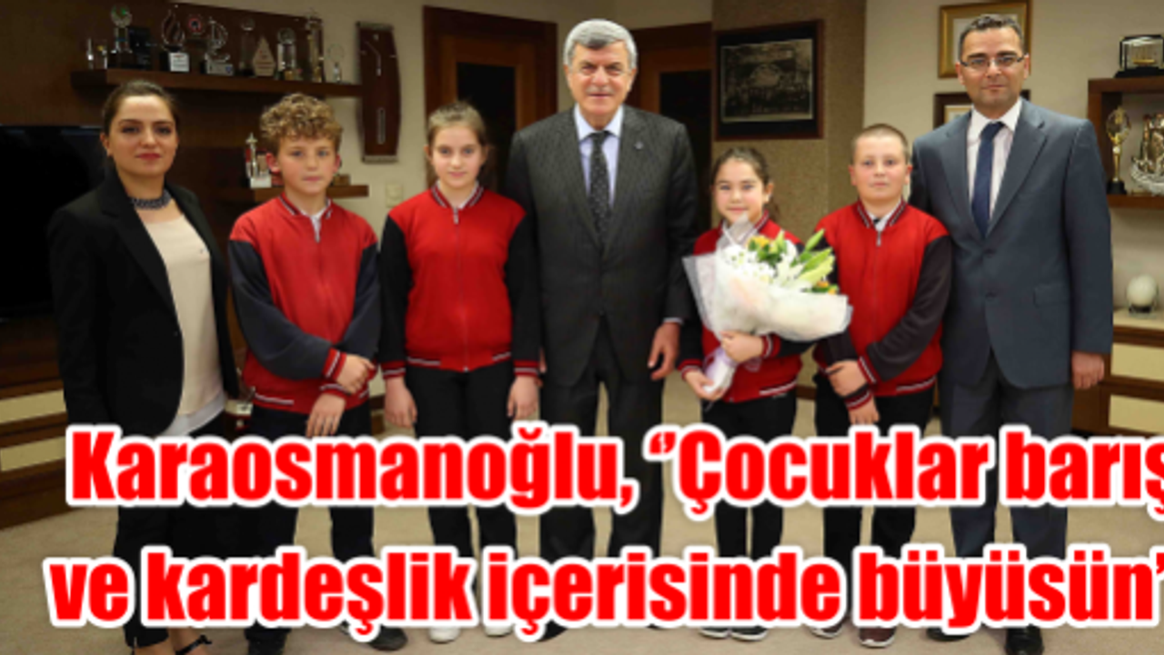 Dr. Ferdi Koçal Ortaokulu Müdürü M.Hicabi Utandı ve Türkçe Öğretmeni Zehra Eren ile birlikte ziyarete gelen Yasemin Küçük, Aysima Sönmez, Mustafa Malçok ve Soykan Tuncay isimli öğrencilerle yakından ilgilenen Başkan Karaosmanoğlu, sıcak ve samimi bir sohbette gerçekleştirdi. Dünyada maalesef savaşların olduğu bir dünyada çocuklarında öldüğünü belirten Başkan Karaosmanoğlu, “Çocuklar aileleriyle birlikte vatanını terk etmek zorunda kalıyor. Barış dolu bir dünyaya yön verecek siz çocuklarımızdır” vurgusu yaptı.