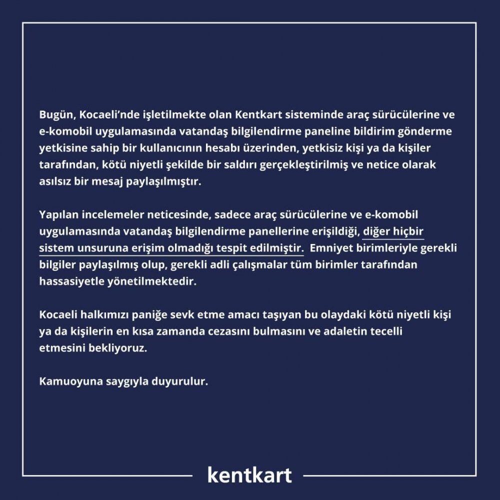 Kentkart'tan yapılan açıklamada, "Bugün, Kocaeli'de işletilmekte olan Kentkart sisteminde araç sürücülerine ve e-komobil uygulamasında vatandaş bilgilendirme paneline bildirim gönderme yetkisine sahip bir kullanıcının hesabı üzerinden, yetkisiz kişi ya da kişiler tarafından, kötü niyetli şekilde bir saldırı gerçekleştirilmiş ve netice olarak asılsız bir mesaj paylaşılmıştır. Yapılan incelemeler neticesinde, sadece araç sürücülerine ve e-komobil uygulamasında vatandaş bilgilendirme panellerine erişildiği, diğer hiçbir sistem unsuruna erişim olmadığı tespit edilmiştir. Emniyet birimleriyle gerekli bilgiler paylaşılmış olup, gerekli adli çalışmalar tüm birimler tarafından hassasiyetle yönetilmektedir. Kocaeli halkımızı paniğe sevk etme amacı taşıyan bu olaydaki kötü niyetli kişi ya da kişilerin en kısa zamanda cezasını bulmasını ve adaletin tecelli etmesini bekliyoruz" denildi.