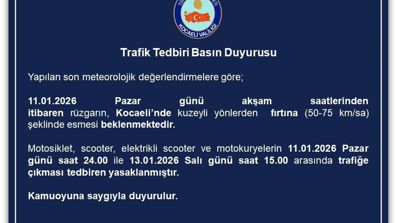 Kocaeli Valiliği tarafından yapılan açıklamada, 'Yapılan son meteorolojik değerlendirmelere göre; 11.01.2026 Pazar günü akşam saatlerinden itibaren rüzgarın, Kocaeli'nde kuzeyli yönlerden fırtına (50-75 km/sa) şeklinde esmesi beklenmektedir. Motosiklet, scooter, elektrikli scooter ve motokuryelerin 11.01.2026 Pazar günü saat 24.00 ile 13.01.2026 Salı günü saat 15.00 arasında trafiğe çıkması tedbiren yasaklanmıştır. Kamuoyuna saygıyla duyurulur' ifadelerine yer verildi.