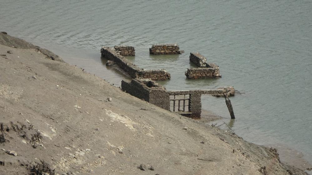 Düşük su seviyesi nedeniyle baraj havzasındaki eski köprü ve yapılar yeniden görünür hale geldi. Dron ile barajın kuraklığı havadan görüntülendi.