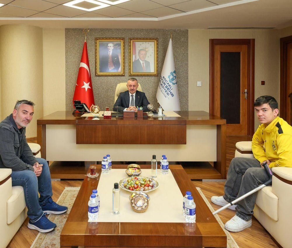 Kocaeli Büyükşehir Belediye Başkanı Doç.Dr. Tahir Büyükakın, 8 Şubat Cumartesi günü oynanan Kocaelispor-Amedspor karşılaşmasında tribünden düşerek yaralanan ve tedavisinin ardından tekrar sağlığına kavuşan 17 yaşındaki Efe Kartal Öztay ve babası Atakan Öztay’ı makamında misafir etti.