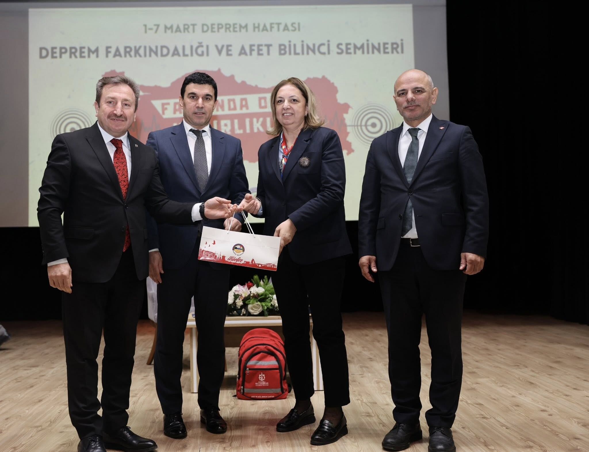İlçe Milli Eğitim Müdürü Sergülen Kurt’un yaptığı kısa selamlama konuşması sonrasında kürsüye gelen Başkan Şener Söğüt, “Deprem kuşağında, deprem gerçeğiyle iç içe yaşayan bir ülkenin evlatları olarak hepimiz biliyoruz ki bunlara hazırlıklı olmalıyız. Bugün, bu konuda bilinçlenme ve ne yapılması gerektiğini konuşmak için buradayız. Hepimiz biliyoruz ki özellikle hafızalarımızda derin izler ve acılar bırakan depremi yaşamış bir şehir olarak, afet ve depremlere hazır olmalıyız.