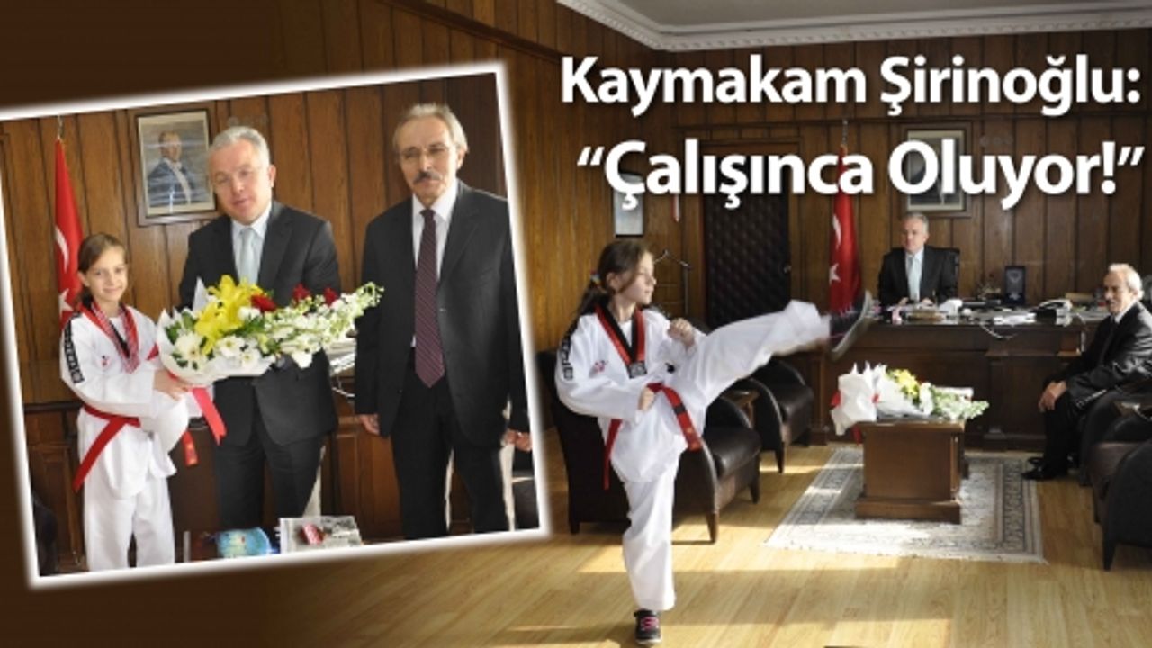 Milli Taekvondocumuz Körfez'in gururu Şevval Yarar'ı makamında kabul eden Kaymakam Mahmut Şirinoğlu ''Kızım bir poomse çizde gözümüzün pası silinsin dedi.