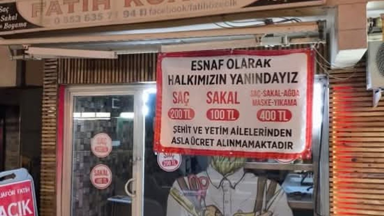 Vitrin camına asılan afişle, saç kesiminin 200 lira, sakal kesiminin 100 lira ve maskeli bakımın ise 400 lira olduğunu duyuran erkek kuaförü, şehit aileleri ve gazilerden ise ücret alınmayacağını belirtti.