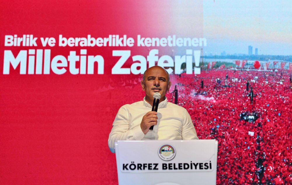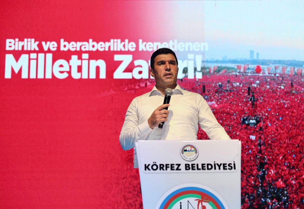 Aydemir’in ardından kürsüye gelen Körfez Belediye Başkanı Şener Söğüt, “Bizlere, dünyada eşine az rastlanan bir ihaneti yaşatan; ama buna karşılık yine tüm cihanın şahit olduğu en büyük cevabı alan 15 Temmuz’un yıldönümündeyiz. Bugün, ihanet şebekelerinin, ağababaları ile işbirliği halinde kendi topraklarını işgale yeltendiği o kara günün yıldönümü. Ama yüce Allah’a şükürler olsun ki o gün; bizim için “15 Temmuz Demokrasi ve Milli Birlik Günü” oldu.