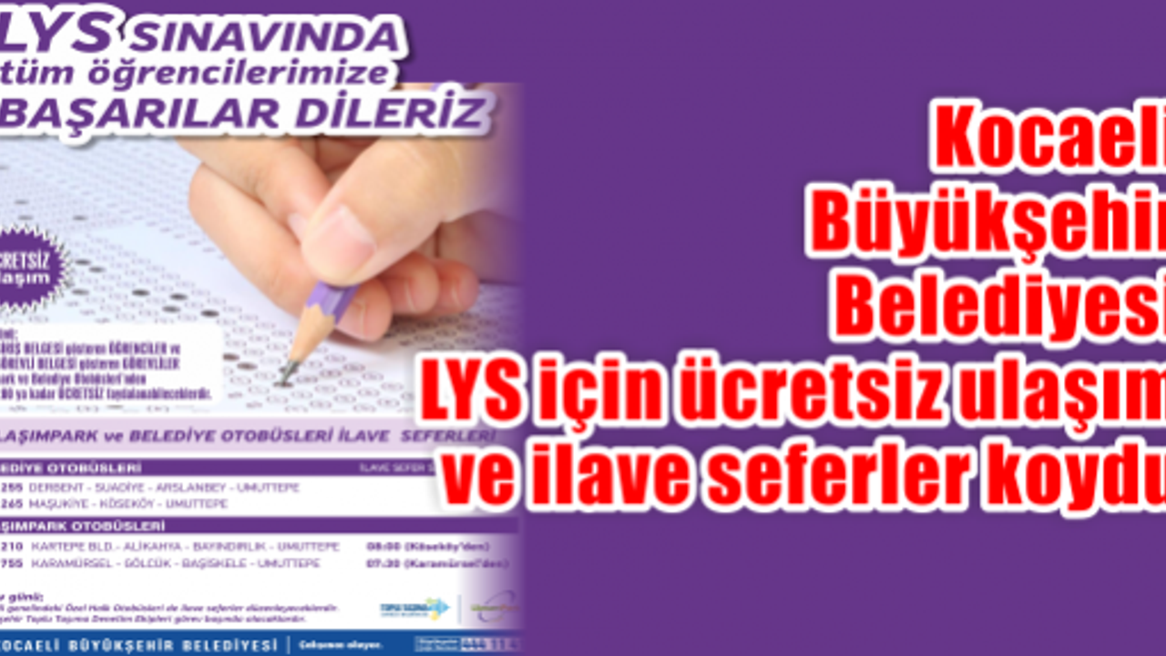 Lisans Yerleştirme Sınavı (LYS) için Kocaeli genelinde ihtiyaç görülen hatlara ilave seferler konuldu. Büyükşehir Belediyesi’ne bağlı 255 nolu hatta çalışan otobüs 07: 45’te Derbent - Suadiye - Arslanbey – Umuttepe güzergahında; 265 numaralı hattaki otobüs 07: 45’te Maşukiye - Köseköy – Umuttepe güzergahında hizmet verecek. Ulaşımpark’a bağlı 210 nolu hatta çalışan otobüs 08:00’de Kartepe Belediyesi- Alikahya - Bayındırlık - Umuttepe güzergahında; 755 nolu hatta çalışan otobüs 07:30’da Karamürsel - Gölcük - Başiskele – Umuttepe güzergahında hizmet verecek.