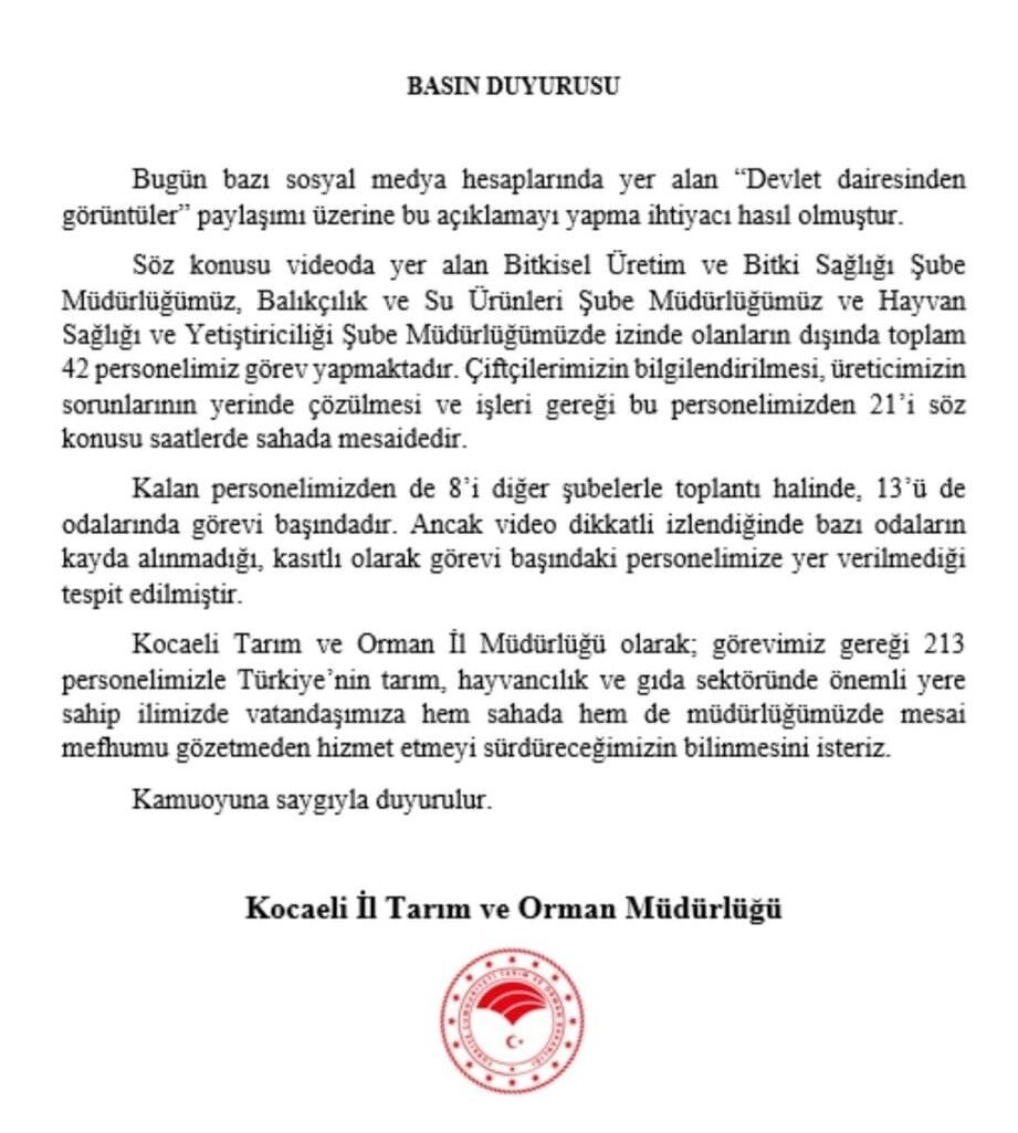 Görüntüler kısa sürede sosyal medyada yayılırken konuya ilişkin Kocaeli İl Tarım ve Orman Müdürlüğü yaptığı açıklamada "Bugün bazı sosyal medya hesaplarında yer alan, 'Devlet dairesinden görüntüler' paylaşımı üzerine bu açıklamayı yapma ihtiyacı hasıl olmuştur. Söz konusu videoda yer alan Bitkisel Üretim ve Bitki Sağlığı Şube Müdürlüğümüz, Balıkçılık ve Su Ürünleri Şube Müdürlüğümüz ve Hayvan Sağlığı ve Yetiştiriciliği Şube Müdürlüğümüzde izinde olanların dışında toplam 42 personelimiz görev yapmaktadır. Çiftçilerimizin bilgilendirilmesi, üreticimizin sorunlarının yerinde çözülmesi ve işleri gereği bu personelimizden 21'i söz konusu saatlerde sahada mesaidedir. Kalan personelimizden de 8'i diğer şubelerle toplantı halinde, 13'ü de odalarında görevi başındadır. Ancak video dikkatli izlendiğinde bazı odaların kayda alınmadığı, kasıtlı olarak görevi başındaki personelimize yer verilmediği tespit edilmiştir. Kocaeli Tarım ve Orman İl Müdürlüğü olarak; görevimiz gereği 213 personelimizle Türkiye'nin tarım, hayvancılık ve gıda sektöründe önemli yere sahip ilimizde vatandaşımıza hem sahada hem de müdürlüğümüzde mesai mefhumu gözetmeden hizmet etmeyi sürdüreceğimizin bilinmesini isteriz" denildi.