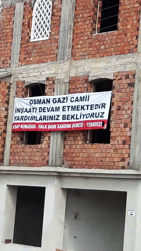 450 m2 büyüklüğündeki 750 kişilik Osman Gazi Cami inşaatı sürüyor. Osman Gazi Cami Yaptırma ve Yaşatma Derneği, caminin inşaatı için yardım talebinde bulundu. Hayırseverleri camiye yardım yapmaya çağıran dernek, camiyi kısa sürede tamamlamayı hedefliyor. Kandıra Orhan Mahallesi Ahmatlı Yolu üzerinde Kandıra Tapu Müdürlüğü yanında bulunan Osman Gazi Camiinin bitirilmesi için cemaat ve hayırseverlerin yardımları bekleniyor.