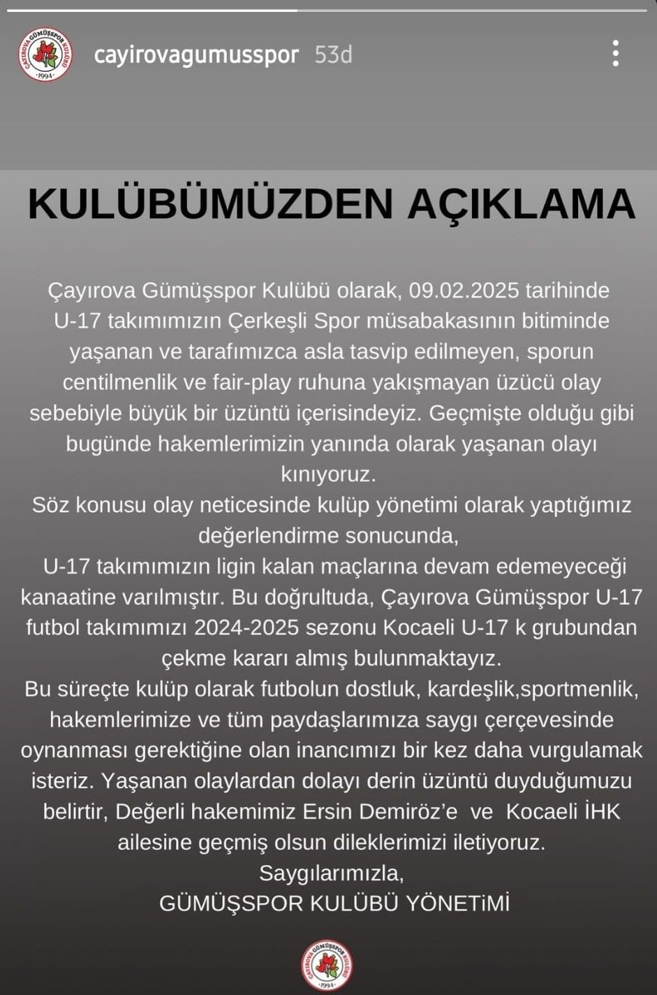 "Çayırova Gümüşspor Kulübü olarak 09.02.2025 tarihinde U-17 takımımızın Çerkeşli Spor müsabakasının bitiminde yaşanan ve tarafımızca asla tasvip edilmeyen, sporun centilmenlik ve fair-play ruhuna yakışmayan üzücü olay sebebiyle büyük bir üzüntü içerisindeyiz. Geçmişte olduğu gibi bugün de hakemlerimizin yanında olarak yaşanan olayı kınıyoruz. Söz konusu olay neticesinde kulüp yönetimi olarak yaptığımız değerlendirme sonucunda, U-17 takımımızın ligin kalan maçlarına devam edemeyeceği kanaatine varılmıştır. Bu doğrultuda Çayırova Gümüşspor U-17 futbol takımımızı 2024-2025 sezonu Kocaeli U-17 K grubundan çekme kararı almış bulunmaktayız. Bu süreçte kulüp olarak futbolun dostluk, kardeşlik, sportmenlik, hakemlerimize ve tüm paydaşlarımıza saygı çerçevesinde oynanması gerektiğine olan inancımızı bir kez daha vurgulamak isteriz. Yaşanan olaylardan dolayı derin üzüntü duyduğumuzu belirtir, değerli hakemimiz Ersin Demiröz'e ve Kocaeli İHK ailesine geçmiş olsun dileklerimizi iletiyoruz."