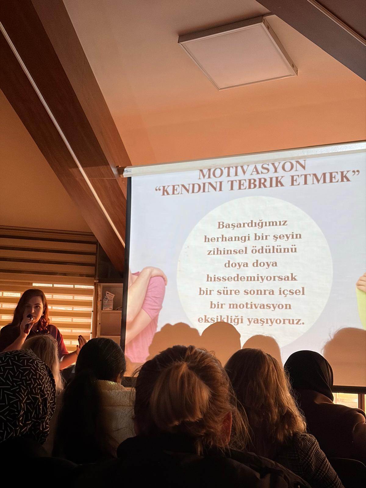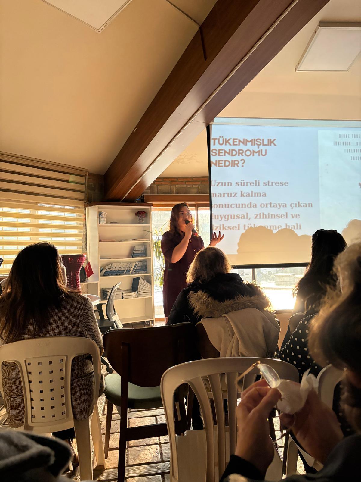 Etkinlikte tükenmişlik sendromu tüm yönleriyle masaya yatırıldı. Söyleşide Psikolog Aslı Tatlı tarafından tükenmişlik sendromunun ne olduğu, belirtileri ve ortaya çıkış nedenleri, günlük yaşamda nasıl fark edildiği ve bu durumla başa çıkma yöntemleri hakkında katılımcılara farkındalık kazandıran bir sunum gerçekleştirildi.