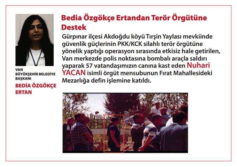 Van Büyükşehir Belediye Başkanı Bedia ÖZGÖKÇE ERTAN; adli makamlarca hakkında yürütülen “Terör Örgütü Propagandası Yapmak” “Suçu ve Suçluyu Övme, Terör Örgütü Propagandası Yapmak” “Silahlı Terör Örgütüne Üye Olmak, Terör Örgütü Propagandası Yapmak” suçlarından (7) ayrı soruşturma ve/veya kovuşturma ile Bakanlığımızca yürütülen (3) ayrı soruşturma kapsamında,